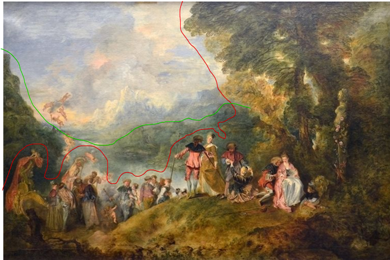 Coulissewerking is typisch zichtbaar in landschapsschilderkunst waarbij het beeld wordt ingedeeld in verschillende plans: een donkere, warme, gedetailleerde voorgrond (onder de rode lijn), gevolgd door een koeler middenplan(onder de groene lijn) en een wazig verblauwende achtergrond (achterplan= boven de groene lijn).