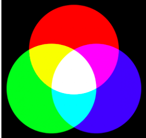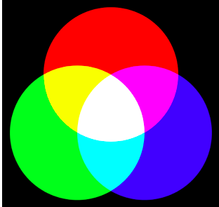 Bij verfkleuren: ultramarijn, vermiljoenrood en geel (RGB)